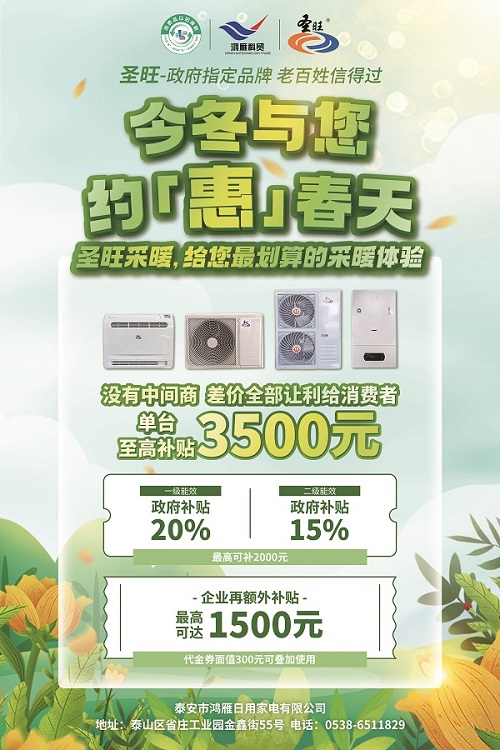 在這個(gè)寒冷的季節(jié),選擇圣旺品牌的空氣源熱泵熱風(fēng)機(jī)、燃?xì)獗趻鞝t及空氣能機(jī)組等采暖設(shè)備,不僅能享受優(yōu)惠補(bǔ)貼,更是為環(huán)保貢獻(xiàn)一份力量。歡迎廣大消費(fèi)者前來(lái)選購(gòu),讓我們一起溫暖過冬!