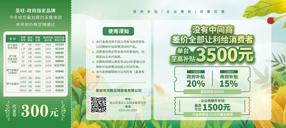 如今,泰安市舉行家電以舊換新補(bǔ)貼政策,我公司三類產(chǎn)品成功入圍,包括空氣源熱泵熱風(fēng)機(jī)、冷水機(jī)組和燃?xì)獗趻鞝t。消費(fèi)者購(gòu)買我公司一級(jí)能耗產(chǎn)品可享受政府 20%的補(bǔ)貼,二級(jí)能耗產(chǎn)品可享受 15%的補(bǔ)貼。在此基礎(chǔ)上,我們面向全市消費(fèi)者再額外發(fā)放 300 萬(wàn)的代金券,單張面值 300 元,共 1 萬(wàn)張。這意味著在政府補(bǔ)貼的同時(shí),消費(fèi)者還能享受我公司讓利 300 至最高 1500 元的優(yōu)惠,真正實(shí)現(xiàn)政企雙補(bǔ),福利翻倍。